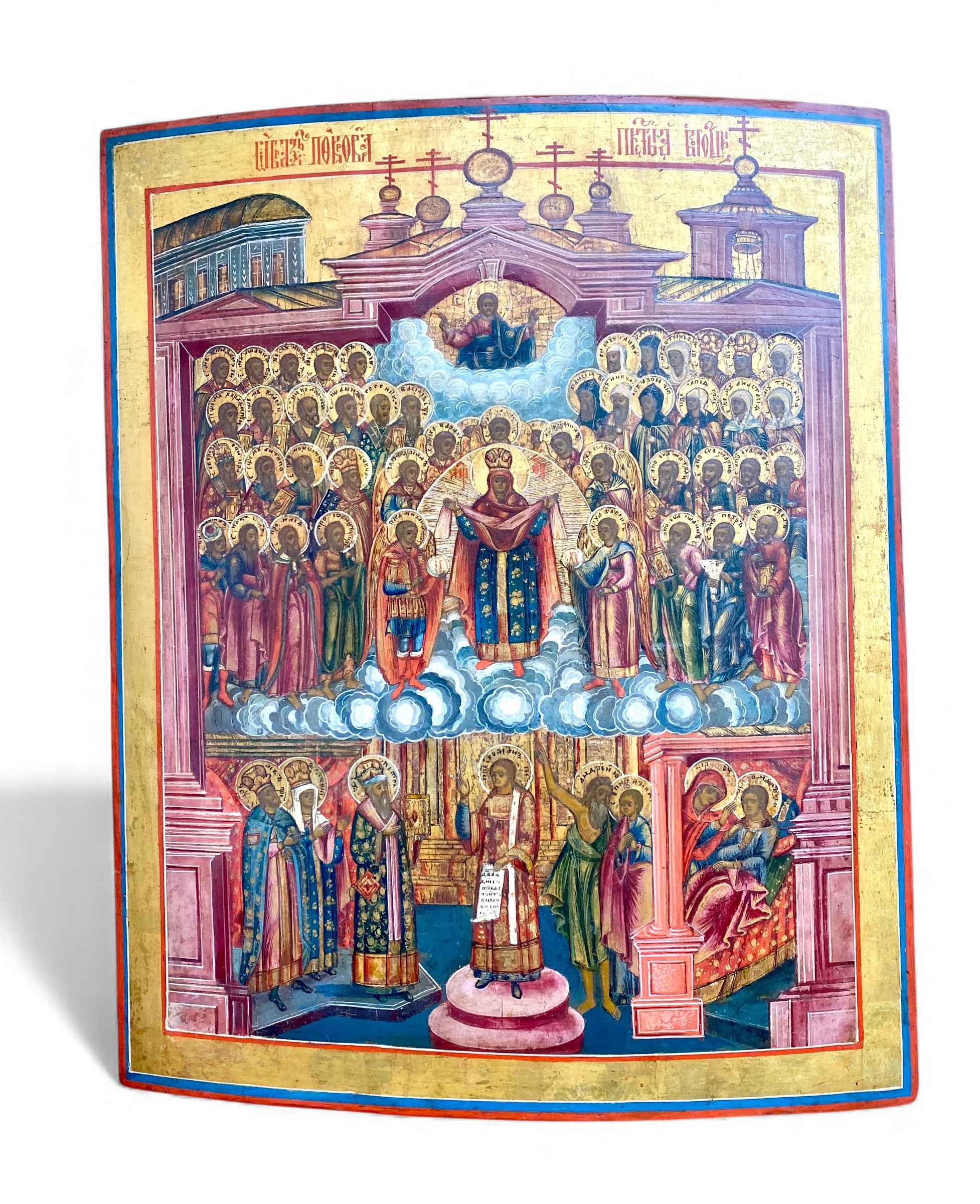 Diese Ikone zeigt das orthodoxe Fest Pokrov (Schutz und Fürbitte der Gottesmutter). Das zentrale Thema ist die Vision des heiligen Andreas des Narren-in-Christus, der die Gottesmutter während eines Gottesdienstes über der versammelten Gemeinde erscheinen sah, wie sie ihren schützenden Schleier über die Welt ausbreitet.